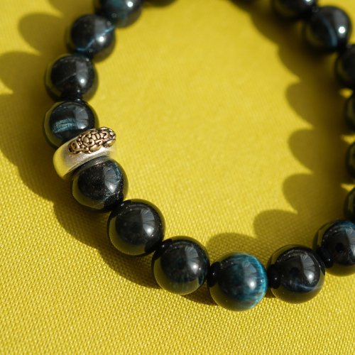 藍虎眼石是最為罕有的品種,黑色底藍色條紋的外形也被稱作「鷹眼石」。藍虎眼石可以讓佩戴者有著更清晰的頭腦和思考,能夠看清事物的全部,不容易受外界騷擾,在工作上有着更高的行動力與效率。另外,藍虎眼石亦對新陳代謝、腸胃、呼吸道等部